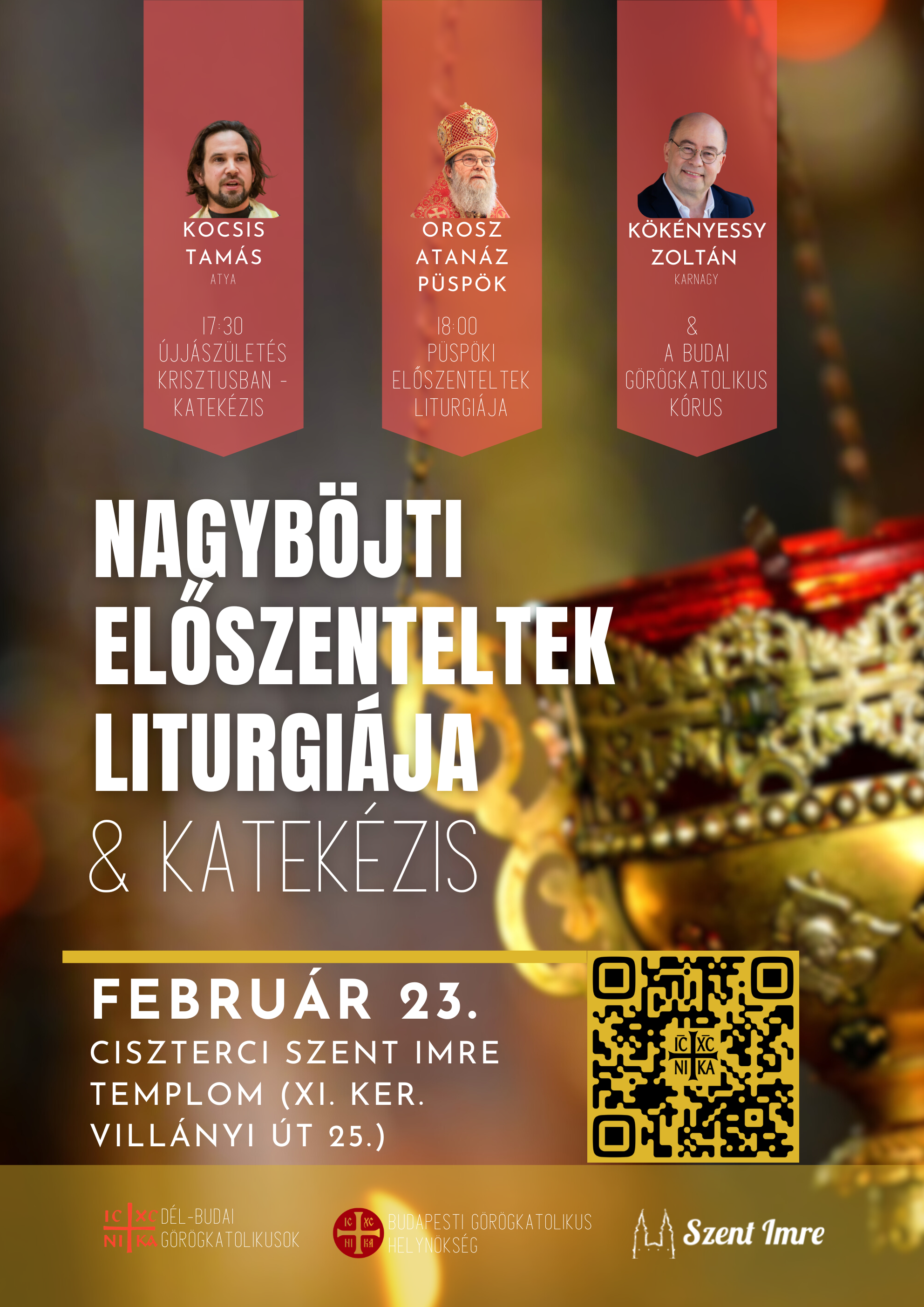 Február 23-án, hétfőn Atanáz miskolci püspök atya vezeti az Elszenteltek Liturgiáját a Villányi úti Szent Imre templomban. A szertartás előtt katekézist hallgathatunk meg Kocsis Tamás atyától 17.30-kor. Ezen a hétfő estén – kivételesen – templomunkban nem lesz szertartás. Részletek az alábbi plakáton olvashatóak (kattintásra megnyílik):